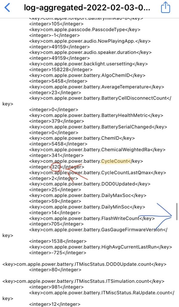 そしてbattery.Cyclecountの文字を探して近くにある数字がバッテリーの充電回数となっています。